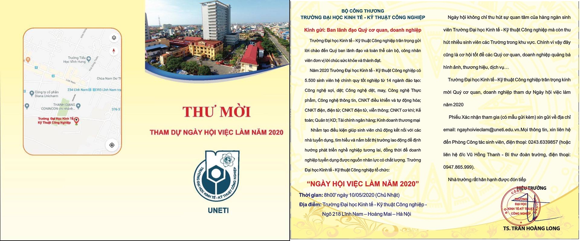 Quy định, Quy chế SV, Thông báo, Thông báo SV Kế hoạch về việc tổ chức ngày hội việc làm UNETI năm 2020 Posted on March 6, 2020April 14, 2021 by quanly Download File [110.00 KB] Thư mời tham dự ngày hội việc làm 2020 (xem tại đây) Phiếu cung cấp thông tin “Tham gia Ngày hội việc UNETI năm 2020” (xem tại đây) Quyết định về việc cấp Giấy chứng nhận kiểm định chất lượng Chương trình đào tạo Ngành Công nghệ kỹ thuật Cơ khí trình độ đại học hệ chính quy Thông báo về kế hoạch học tập từ ngày 09/03 đến ngày 15/03/2020