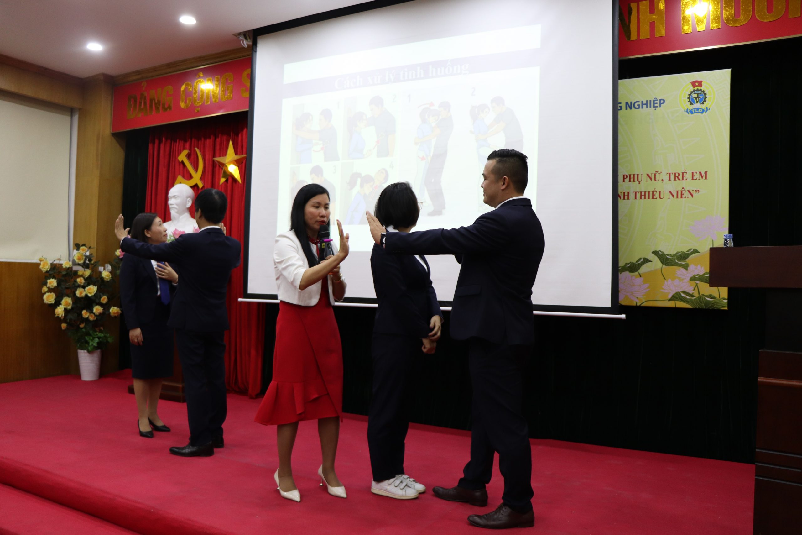 Các công đoàn viên tham gia các tính huống trải nghiệm thực tế được lồng ghép trong hội nghị