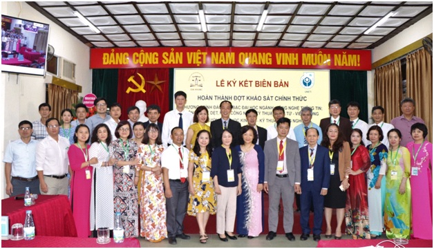 Đoàn chuyên gia đánh giá ngoài chụp ảnh lưu niệm với lãnh đạo và cán bộ giảng viên Khoa Công nghệ thông tin sau buổi lễ