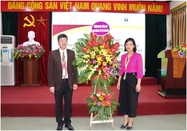 Bà Phạm Thị Thúy Vân tặng hoa chúc mừng Nhà trường tại lễ bế mạc
