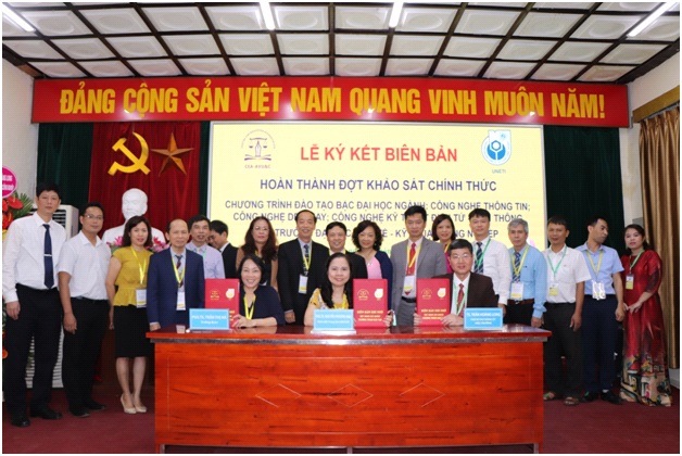 TS Trần Hoàng Long – Phó Bí thư ĐU, Hiệu trưởng Nhà trường và PGS.TS Nguyễn Phương Nga – Giám đốc Trung tâm KĐCLGD thuộc Hiệp hội các trường đại học, cao đẳng Việt Nam cùng PGS.TS Trần Thị Hà – Trưởng đoàn đánh giá ngoài ký biên bản hoàn thành đợt khảo sát chính thức