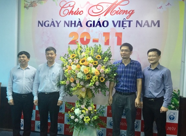 Các thầy trong Ban giám hiệu Nhà trường nhận hoa chúc mừng từ đại diện Vụ Tổ chức cán bộ – Bộ Công thương