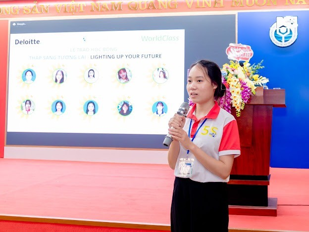 Tại buổi lễ đại diện cho 10 em sinh viên được nhận học bổng “Thắp sáng tương lai” của Deloitte Việt Nam, em Nguyễn Thị Vân Anh – Lớp ĐHKT17A2NĐ đã bày tỏ sự biết ơn sâu sắc đến Thầy cô lãnh đạo Nhà trường, lãnh đạo công ty Deloitte Việt Nam đã tạo điều kiện cho em và các bạn có hoàn cảnh khó khăn phấn đấu vươn lên trong học tập.