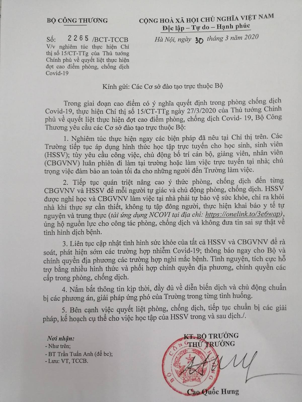 Thông báo Công văn số: 2265/BCT-TCCB ngày 30/3/2020 của Bộ Công Thương về việc quyết liệt thực hiện đợt cao điểm phòng, chống dịch Covid-19 Posted on March 30, 2020 by quanly Thông báo về việc tăng cường thực hiện các biện pháp phòng chống dịch Covid-19 trong đợt cao điểm từ ngày 28/03/2020 đến ngày 15/04/2020 Thông tư số 07/2020/TT-BGDĐT ngày 20/3/2020 sửa đổi, bổ sung một số điều của Thông tư số 06/2018/TT-BGDĐT ngày 28 tháng 02 năm 2018 của Bộ trưởng Bộ Giáo dục và Đào tạo quy định về việc xác định chỉ tiêu tuyển sinh trình độ trung cấp, cao đẳng các ngành đào tạo giáo viên; trình độ đại học, thạc sĩ, tiến sĩ; được sửa đổi, bổ sung tại Thông tư 01/2019/TT-BGDĐT ngày 28 tháng 02 năm 2019 của Bộ trưởng Bộ Giáo dục và Đào tạo