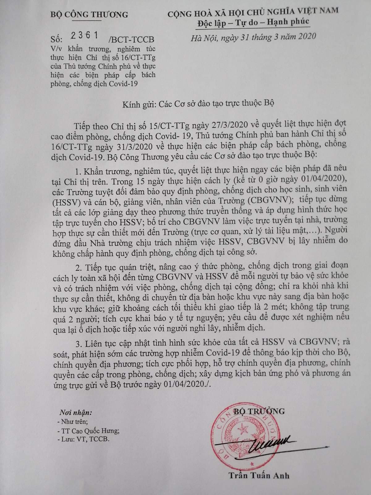 Công văn số 2361/BCT-TCCB ngày 31/3/2020 của Bộ trưởng Bộ Công Thương về việc khẩn trương, nghiêm túc thực hiện Chỉ thị số 16/CT-TTg của Thủ tướng Chính phủ về thực hiện các biện pháp cấp bách phòng, chống dịch Covid-19
