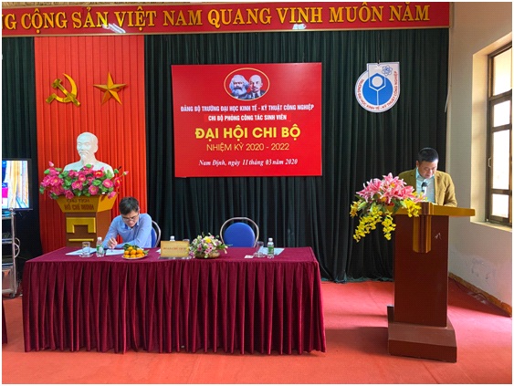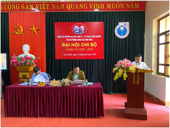 Đại hội chi bộ Phòng Công tác sinh viên đã tiến hành đầy đủ các bước trình tự theo hướng dẫn tổ chức của Ban thường vụ Đảng ủy Khối các cơ quan tỉnh Nam Định và của Đảng ủy Nhà trường. Đại hội đã nghe đồng chí Nguyễn Như Vĩnh – Phó Bí thư Chi bộ nhiệm kỳ 2017 – 2020 thay mặt Đoàn chủ tịch trình bày Báo cáo tổng kết hoạt động của chi bộ trong nhiệm kỳ 2017 – 2020 và phương hướng hoạt động cho nhiệm kỳ 2020 – 2022.