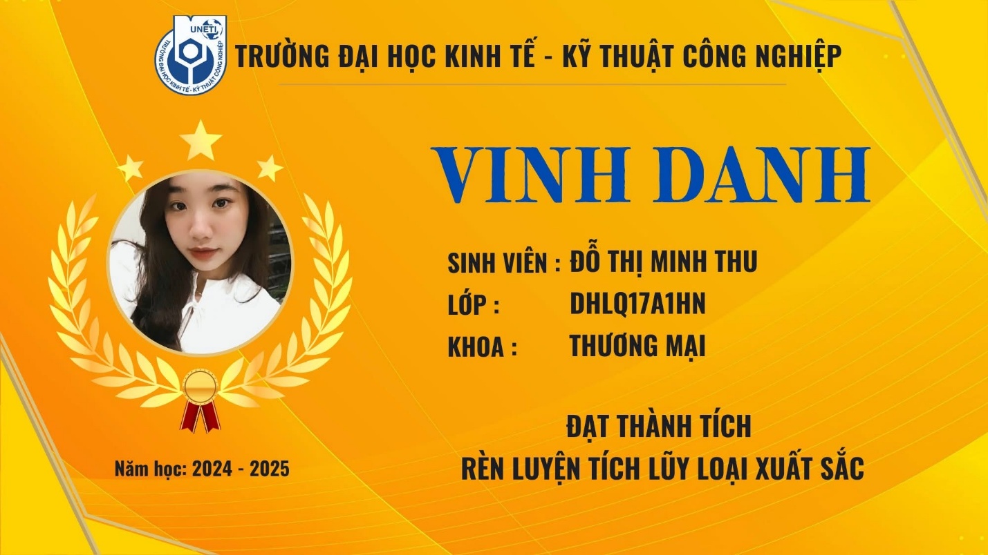 Nhờ sự hoạt động năng nổ, cống hiến trong hai năm theo học tại Uneti Minh Thu không ít lần được nhận bằng khen trao thưởng của nhà trường trao tặng như: rèn luyện xuất sắc, đoàn viên ưu tú,…. Đây là món quà khích lệ tinh thần cũng như động lực để Minh Thu tự nhắc nhở bản thân mình cố gắng phát triển hơn mỗi ngày.