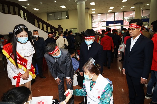 Th.S Vũ Hồng Thanh – Bí thư Đoàn TNCS HCM Nhà trường cùng các đại biểu tham dự hỏi thăm các tình nguyện viên tham gia hiến máu tại Ngày hội