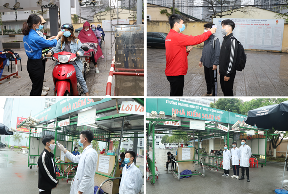 Căn cứ theo kế hoạch đào tạo đã được Nhà trường thông báo, trong ngày 16/03/2021 Gần 2.000 sinh viên đại học chính quy khóa 11,12 quay trở lại trường học tập sau đợt nghỉ học do dịch bệnh Covid-19. Để đảm bảo an toàn cho cán bộ, giảng viên và sinh viên, Ban Giám hiệu và Ban chỉ đạo phòng chống dịch bệnh Covid-19 của Trường Đại học Kinh tế – Kỹ thuật Công nghiệp đã ban hành các thông báo, hướng dẫn thực hiện khuyến cáo của Bộ Y tế. Toàn bộ các giảng đường, phòng học, phòng làm việc, hành lang, khuôn viên ngoài trời đã được Nhà trưởng tổ chức dọn vệ sinh, phun thuốc Cloramin B, công tác dọn vệ sinh sẽ liên tục được tăng cường thực hiện. Sinh viên được đo thân nhiệt trước khi vào khu vực giảng đường. Tại lớp học, trước khi bắt đầu giờ học, sinh viên được giảng viên trao đổi chung tình hình dịch bệnh Covid-19 và cách phòng, tránh dịch bệnh cho bản thân, cộng đồng với những bạn sinh viên có bất kỳ biểu hiện nào như sốt trên 37 độ, ho, khó thở trong khi đang học cần báo ngay cho giảng viên bộ môn và bộ phận Y tế Nhà trường; nếu sinh viên có những biểu hiện trên khi đang trong thời gian ở nhà cần tự cách ly và báo ngay cho cán bộ Y tế và cố vấn học tập lớp được biết để có những biện pháp xử lý kịp thời. Trong khuôn viên, Nhà trường cũng bố trí các điểm sát khuẩn tay nhanh cho cán bộ, giảng viên, sinh viên thuận tiện trong việc giữ vệ sinh chung, bộ phận Y tế Nhà trường đã chủ động các biện pháp nghiệp vụ, phòng cánh ly, thuốc, nước sát khuẩn sẵn sàng xử lý các trường hợp xảy ra…