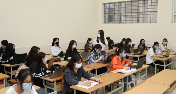 Các sinh viên được bố trí ngồi giản cách và đeo khẩu trang theo đúng khuyến cáo của Nhà trường