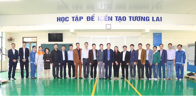 Các đại biểu chụp ảnh lưu niệm tại khu xưởng thực hành của Nhà trường