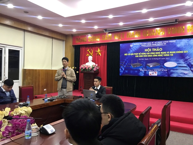 Thực hiện chủ trương của Ban Giám hiệu Nhà trường về việc đẩy mạnh công tác nghiên cứu khoa học trong cán bộ giảng viên và sinh viên. Trong 02 ngày từ 13/01 đến 14/01/2021, tại phòng Hội thảo HA8, số 218 Lĩnh Nam – Hoàng Mai – Hà Nội, khoa Công nghệ thông tin phối hợp cùng Công ty TNHH CNTT An Phát tổ chức Hội thảo với chủ đề “Một số giải pháp để nâng cao công nghệ mạng và mạng không dây cho sinh viên ngành Công nghệ thông tin”.