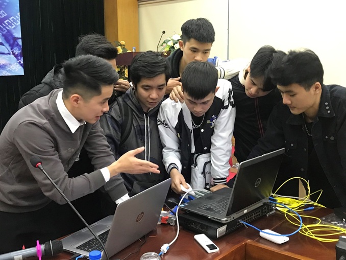 Chuyên viên Nguyễn Văn Đạt hướng dẫn các em sinh viên cấu hình thiết bị mạng