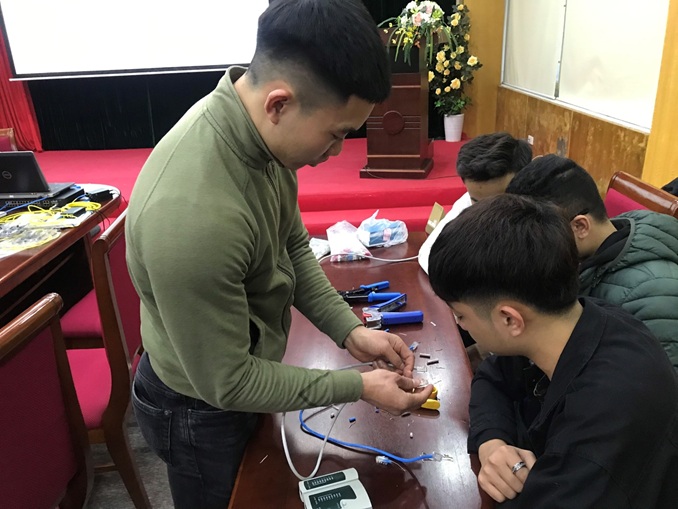 Chuyên viên Nguyễn Huy Hải hướng dẫn các em sinh viên bấm đầu dây mạng.