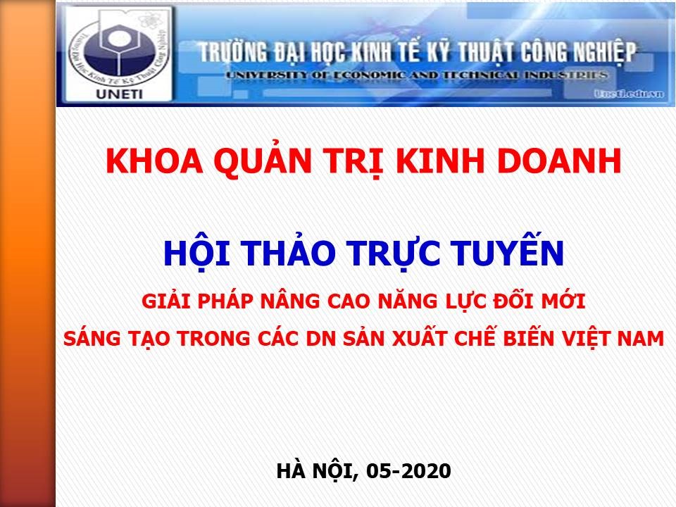 Thực hiện sự chỉ đạo của Đảng ủy, Ban giám hiệu Nhà trường về tăng cường các hoạt động nghiên cứu khoa học và trao đổi học thuật chuyên môn giữa Nhà trường và doanh nghiệp, sáng ngày 06/05/2020, Khoa Quản trị kinh doanh đã tổ chức Hội thảo“Giải pháp nâng cao năng lực đổi mới sáng tạo trong các doanh nghiệp sản xuất chế biến Việt Nam”. Hội thảo được tổ chức trực tuyến với sự tham gia của gần 100 người, bao gồm các vị đại biểu khách mời đến từ doanh nghiệp, giảng viên và sinh viên khoa QTKD.