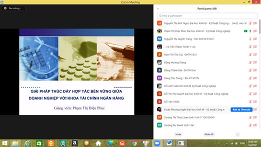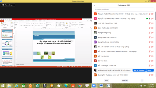 Thực hiện chủ trương của Ban Giám hiệu Nhà trường về việc đẩy mạnh công tác nghiên cứu khoa học trong cán bộ giảng viên và sinh viên, ngày 04/03/2021 qua ứng dụng họp trực tuyến Zoom, khoa Tài chính Ngân hàng tổ chức hội thảo với chủ đề “Hội thảo thúc đẩy hợp tác giữa doanh nghiệp và khoa Tài chính Ngân hàng – Đại học Kinh tế Kỹ thuật Công nghiệp”