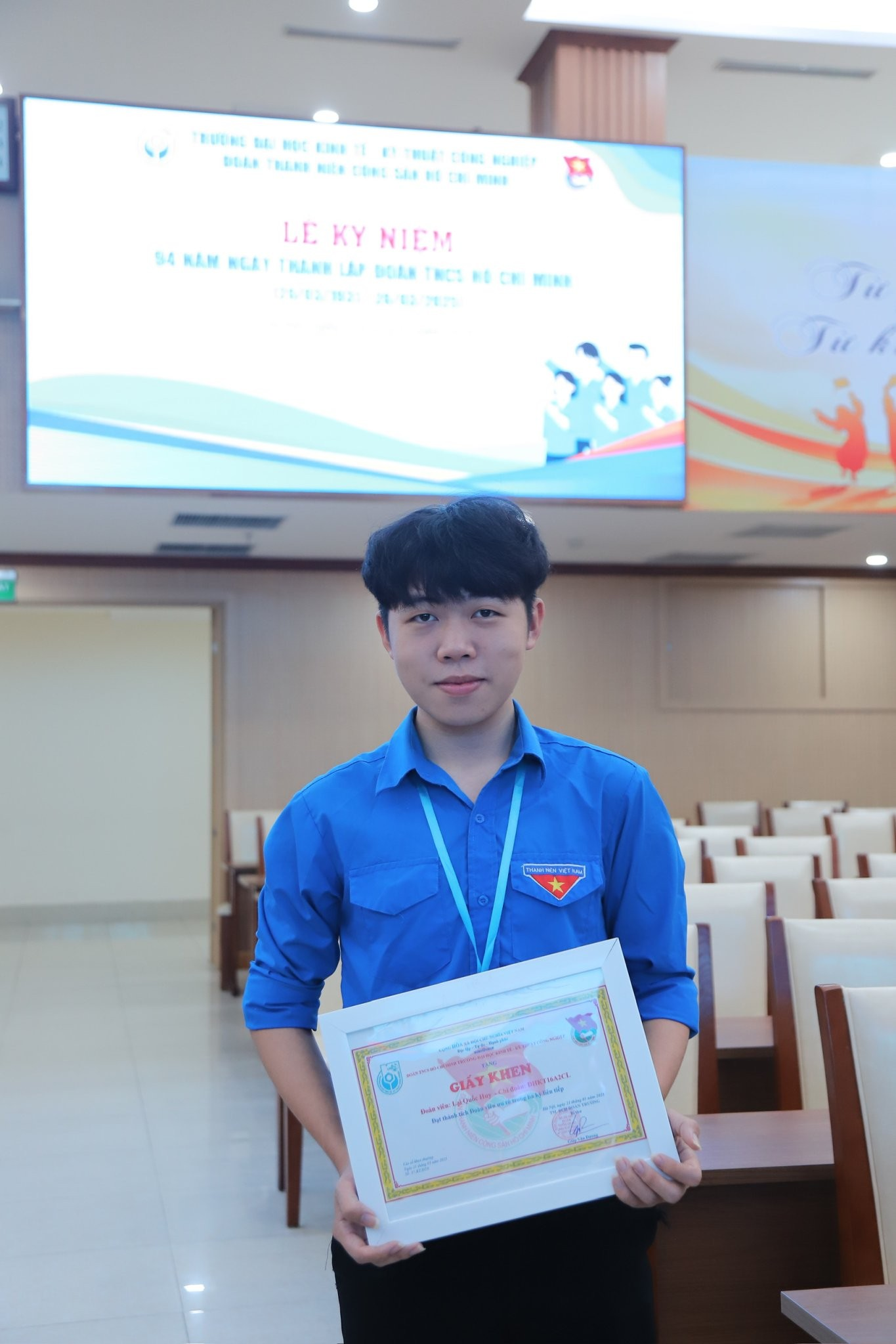 Mang trong mình ngọn lửa nhiệt huyết và tinh thần trách nhiệm, chàng trai ấy luôn hết mình trong mọi hoạt động, phong trào của lớp và của trường. Chính sự tận tâm và nỗ lực ấy đã được Đoàn trường cùng Phòng Chính trị và Công tác Sinh viên ghi nhận, trân trọng bằng những tấm bằng khen và thành tích rực rỡ, là minh chứng cho một tuổi trẻ sống hết mình và cống hiến không ngừng.