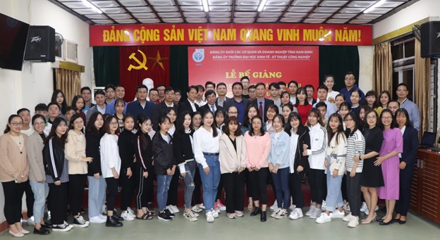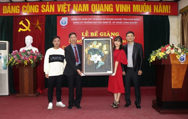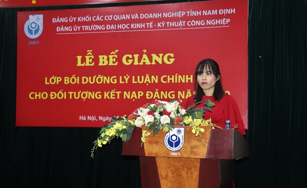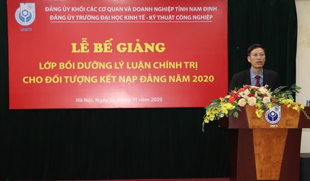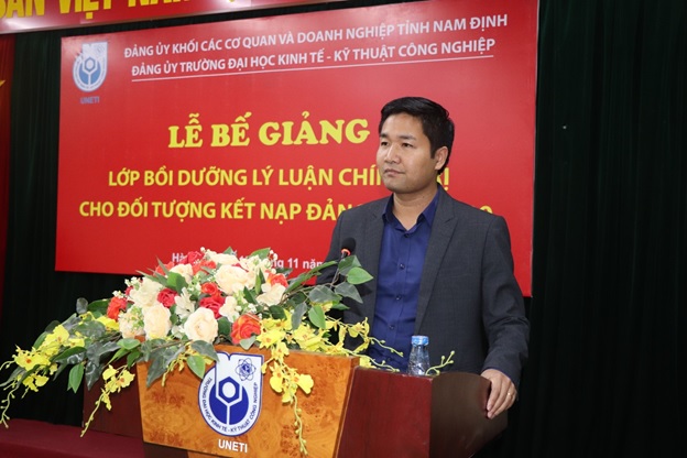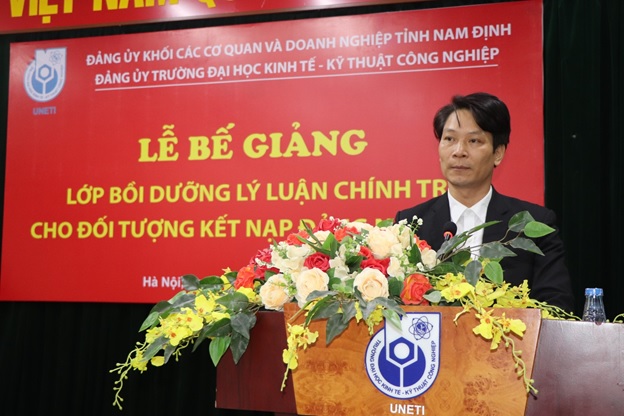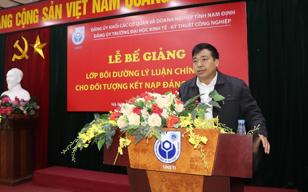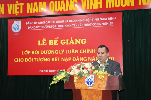 Phát biểu tại buổi lễ, đồng chí Bùi Hoàng Tùng – Phó Bí thư kiêm Trưởng ban chỉ đạo các lớp học của Đảng ủy khối các cơ quan và doanh nghiệp tỉnh Nam Định ghi nhận, biểu dương và đánh giá cao những kết quả nổi bật mà các học viên lớp học đạt được. Đồng chí đề nghị các học viên tiếp tục nêu cao tinh thần trách nhiệm, tính tiên phong gương mẫu, phấn đấu hoàn thành xuất sắc nhiệm vụ được giao, sớm trở thành đảng viên Đảng Cộng sản Việt Nam. Nhân dịp sắp đến ngày Nhà giáo Việt Nam 20/11 đồng chí Phó Bí thư Đảng ủy khối chúc tập thể sư phạm và sinh viên Trường Đại học Kinh tế – Kỹ thuật Công nghiệp sức khỏe, hạnh phúc và thành công.