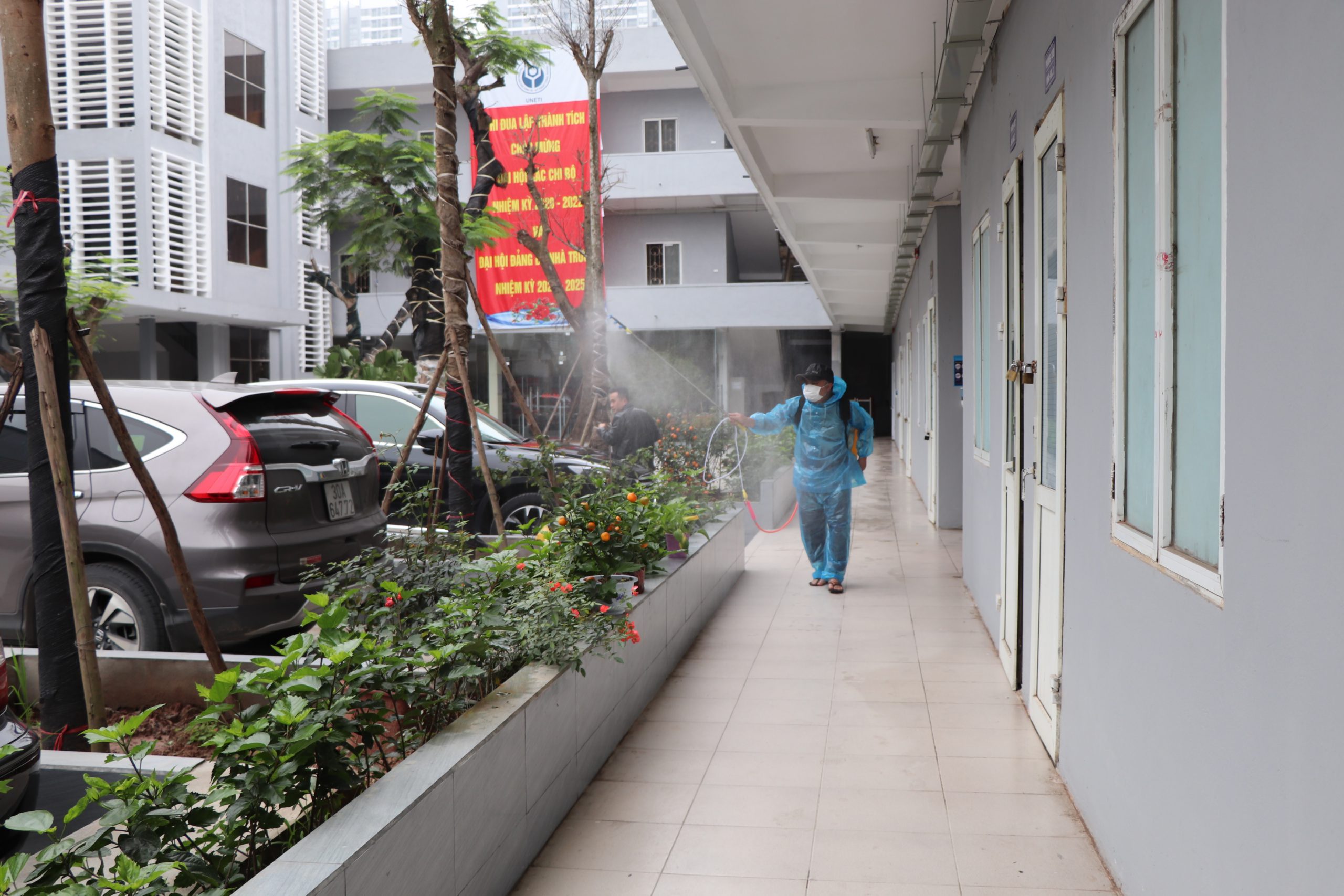Phun thuốc khử trùng CloraminB các phòng học và khuôn viên tại các cơ sở của Nhà trường