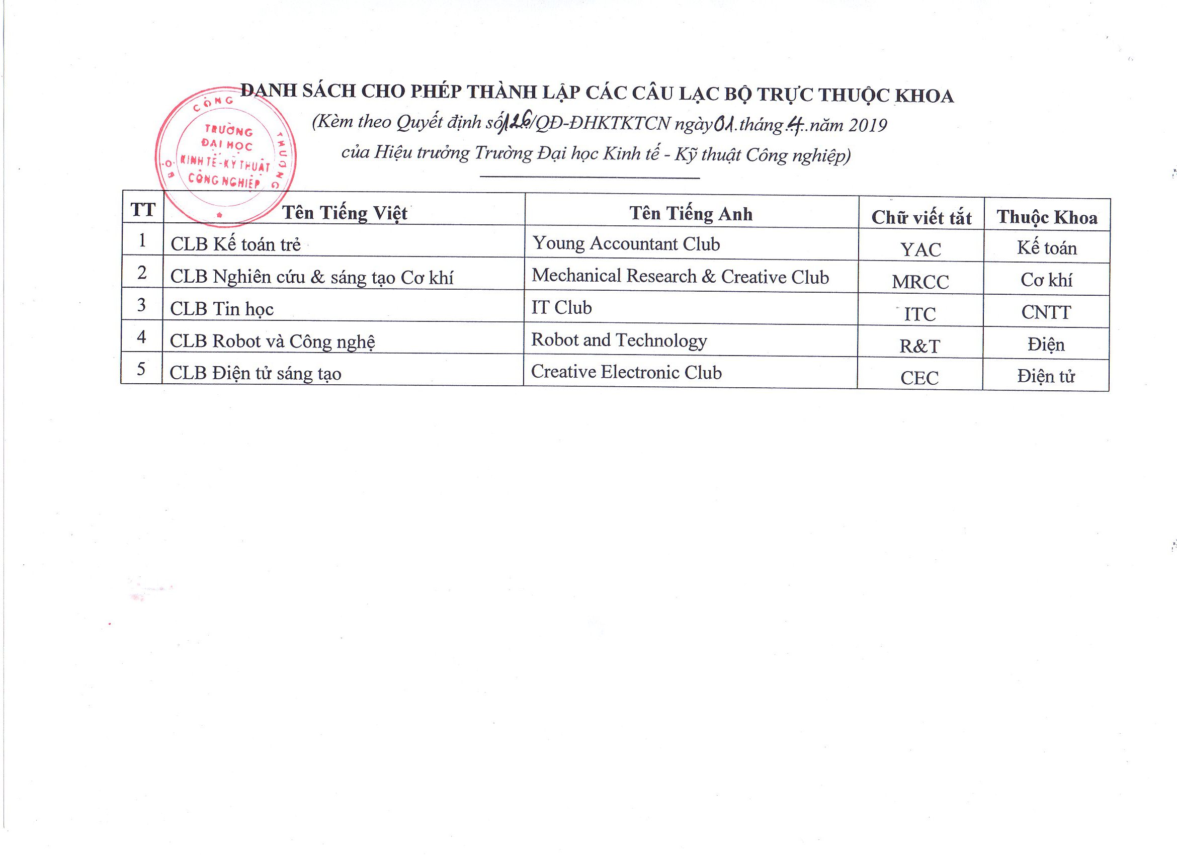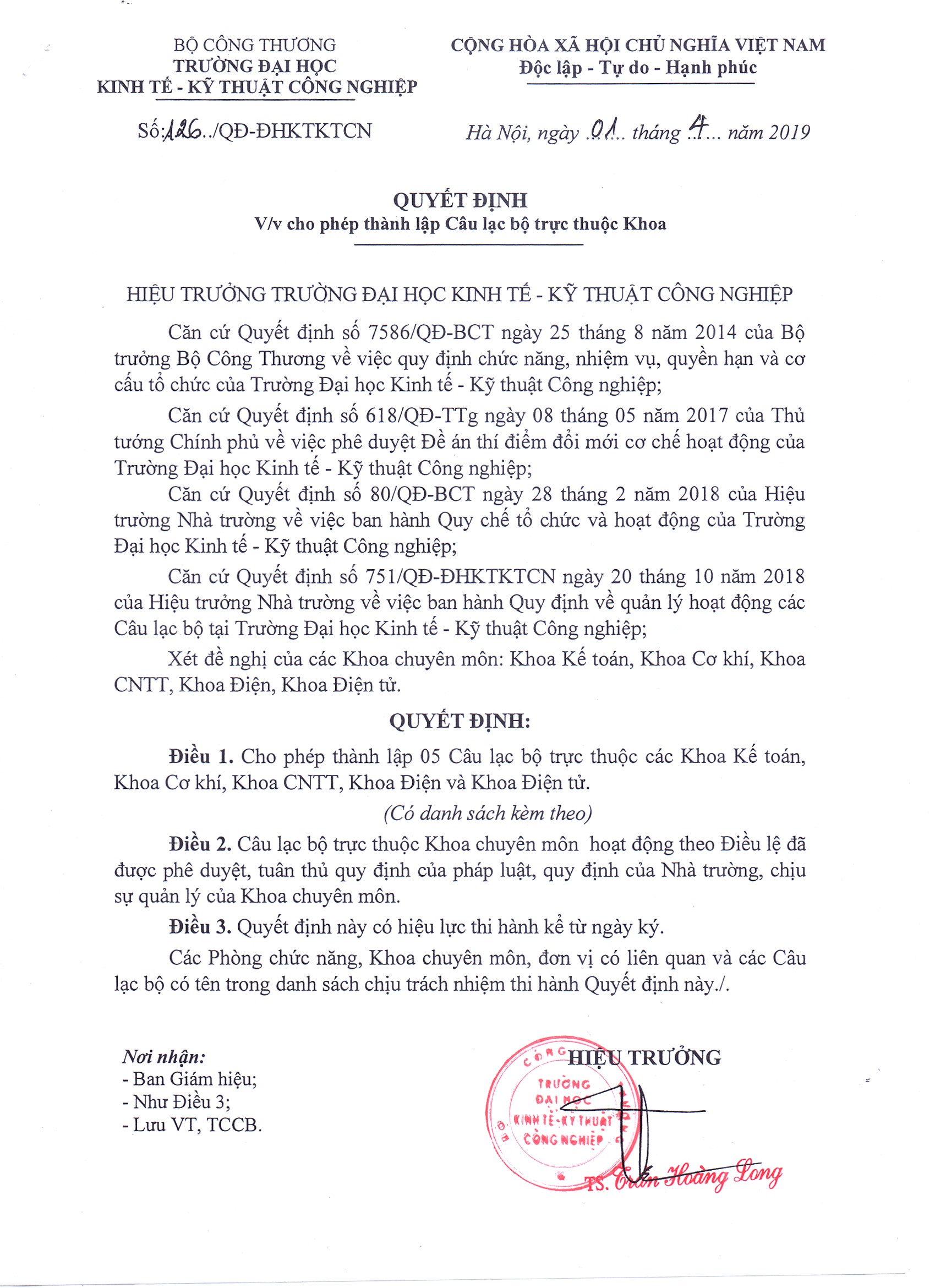 Câu lạc bộ sinh viên Quyết định số 126/QĐ-ĐHKTKTCN ngày 01 tháng 4 năm 2019 của Hiệu trường Trường Đại học Kinh tế – Kỹ thuật Công nghiệp về việc cho phép thành lập Câu lạc bộ trực thuộc Khoa Posted on April 1, 2019April 15, 2020 by quanly Thông tư sửa đổi, bổ sung một số điều của quy chế tuyển sinh năm 2019 Quyết định ban hành Quy chế tổ chức và hoạt động Hội Khuyến học Trường Đại học Kinh tế – Kỹ thuật Công nghiệp