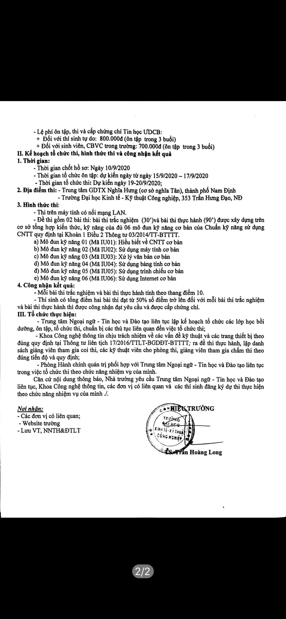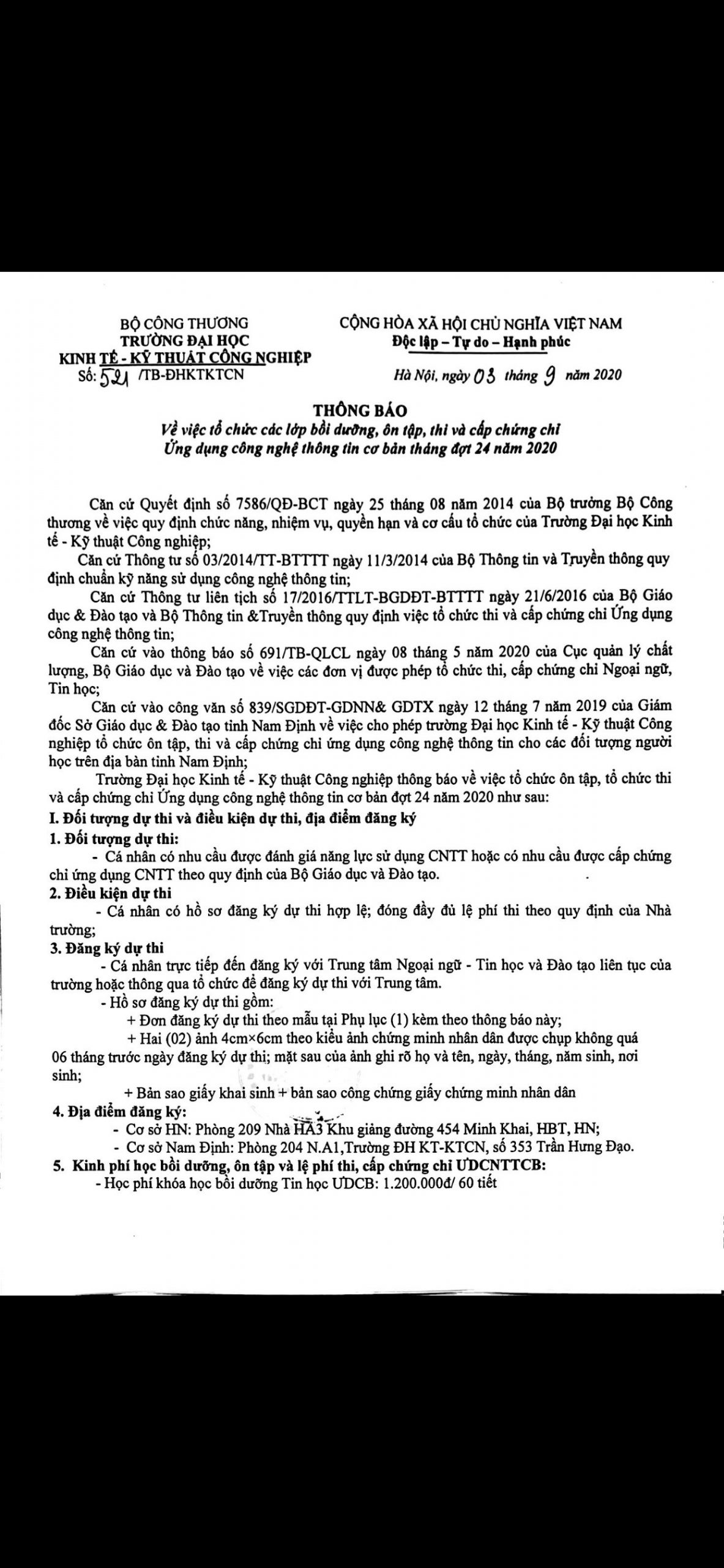 Thông báo Thông báo tổ chức thi ứng dụng công nghệ thông tin cơ bản đợt 24 Posted on September 7, 2020September 9, 2020 by quanly Trường Đại học Kinh tế – Kỹ thuật Công nghiệp tổ chức nhập học cho thí sinh trúng tuyển đại học chính quy theo hình thức học bạ THPT năm 2020. Thông báo về việc đánh giá các học phần và tổ chức thi kết thúc học phần