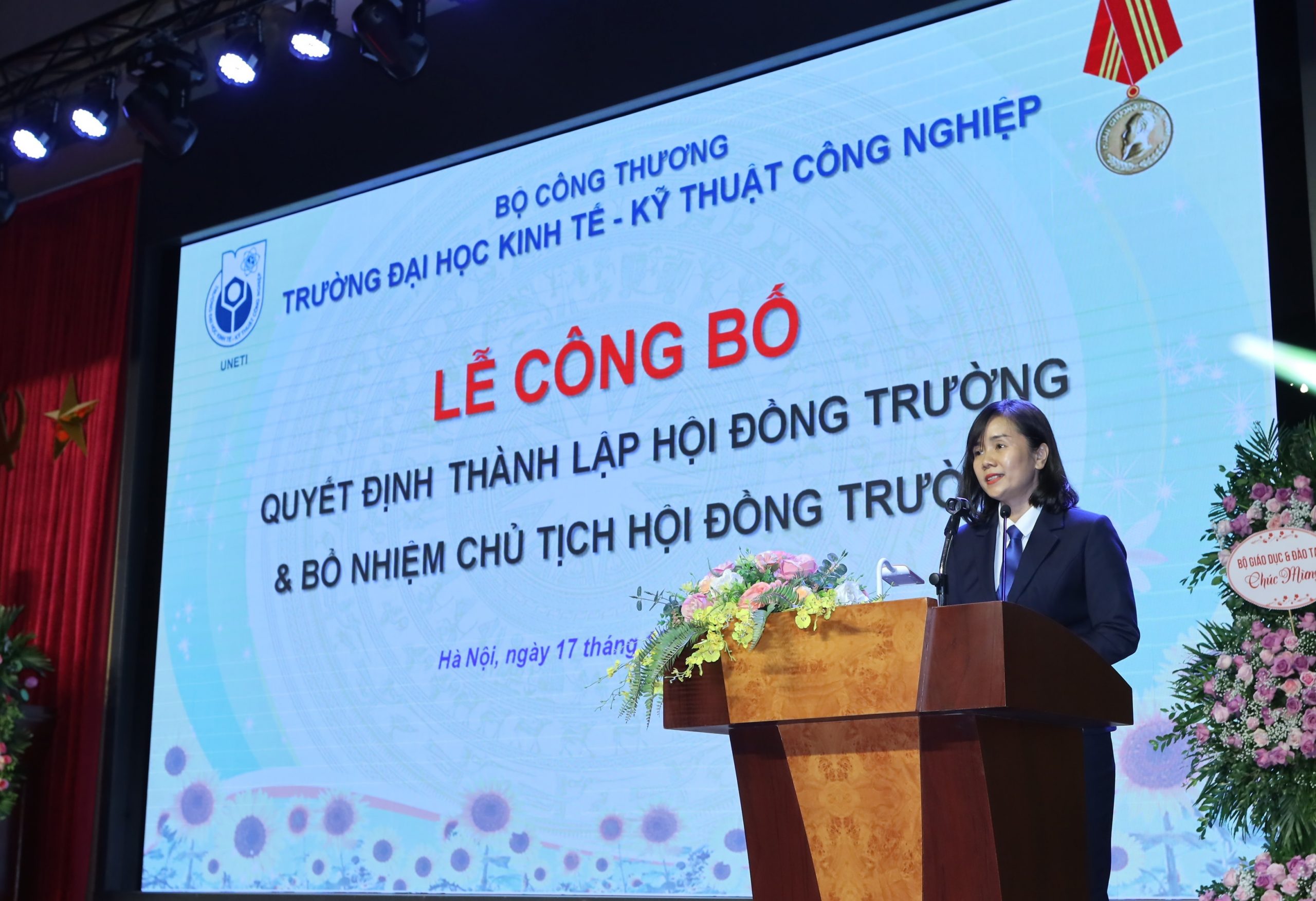 Trong chương trình buổi lễ, Thừa ủy quyền của Bộ trưởng Bộ Công Thương, Ông Phạm Anh Tuấn – Phó Trưởng Phòng cán bộ công chức và bảo vệ chính trị nội bộ – Bộ Công thương đã lên công bố Quyết định số 2518/QĐ-BCT ngày 28/09/2020 về việc công nhận 19 thành viên Hội đồng Trường Đại học Kinh tế – Kỹ thuật Công nghiệp nhiệm kỳ 2020-2025 và Quyết định số 2519/QĐ-BCT ngày 28/09/2020 về việc công nhận TS Phạm Thị Thu Hoài giữ chức vụ Chủ tịch Hội đồng Trường Đại học Kinh tế – Kỹ thuật Công nghiệp nhiệm kỳ 2020 – 2025.