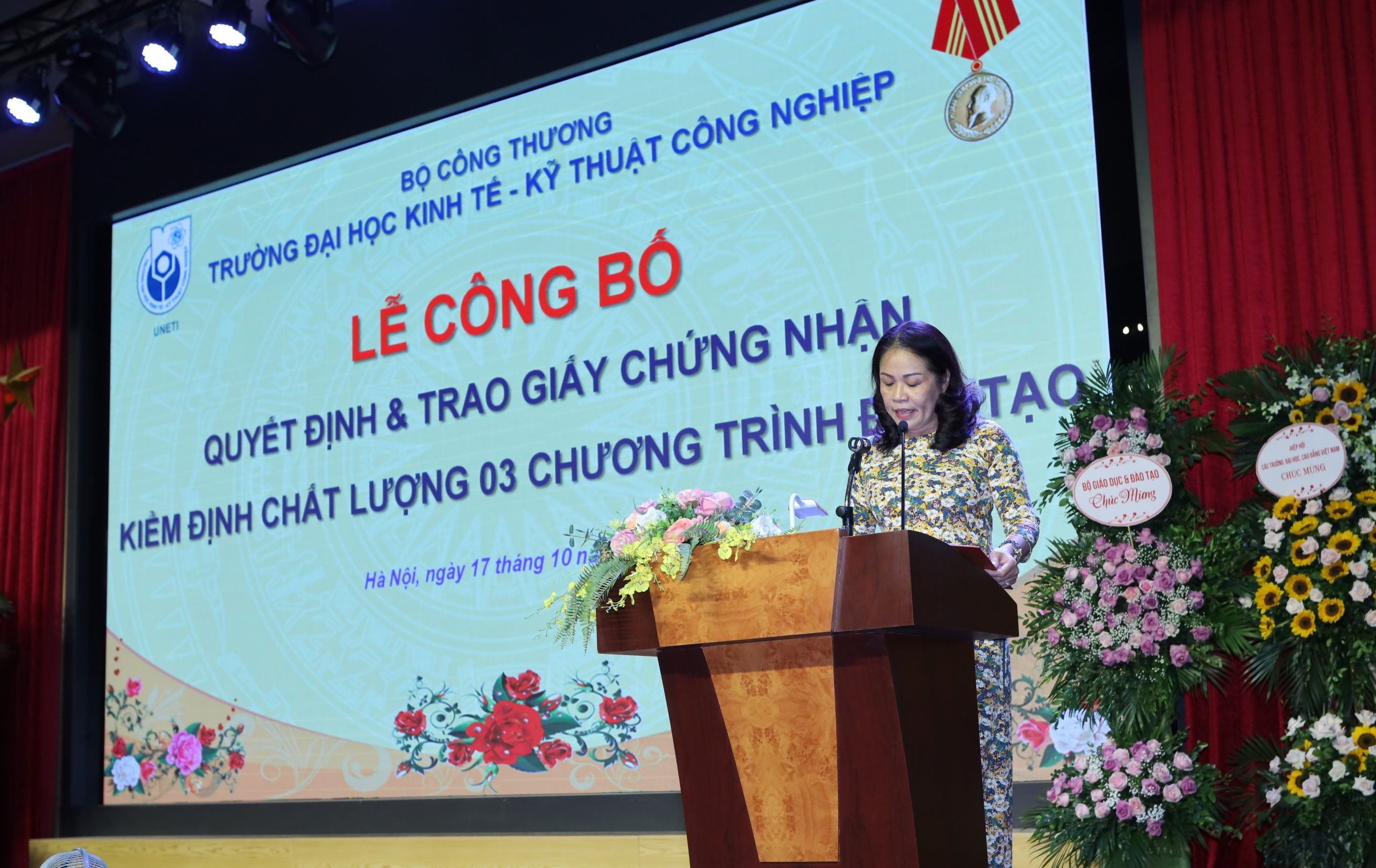 Tiếp theo chương trình, TS. Lê Thị Kim Dung – Trưởng Phòng Hợp tác và phát triển, Trung tâm kiểm định chất lượng giáo dục thuộc Hiệp hội các trường đại học, cao đẳng Việt Nam lên Công bố Quyết định cấp Giấy chứng nhận Kiểm định chất lượng CTĐT cho 03 Chương trình đào tạo ngành Công nghệ Dệt, May; Công nghệ Thông tin và Công nghệ kỹ thuật Điện tử – Viễn thông của Nhà trường.