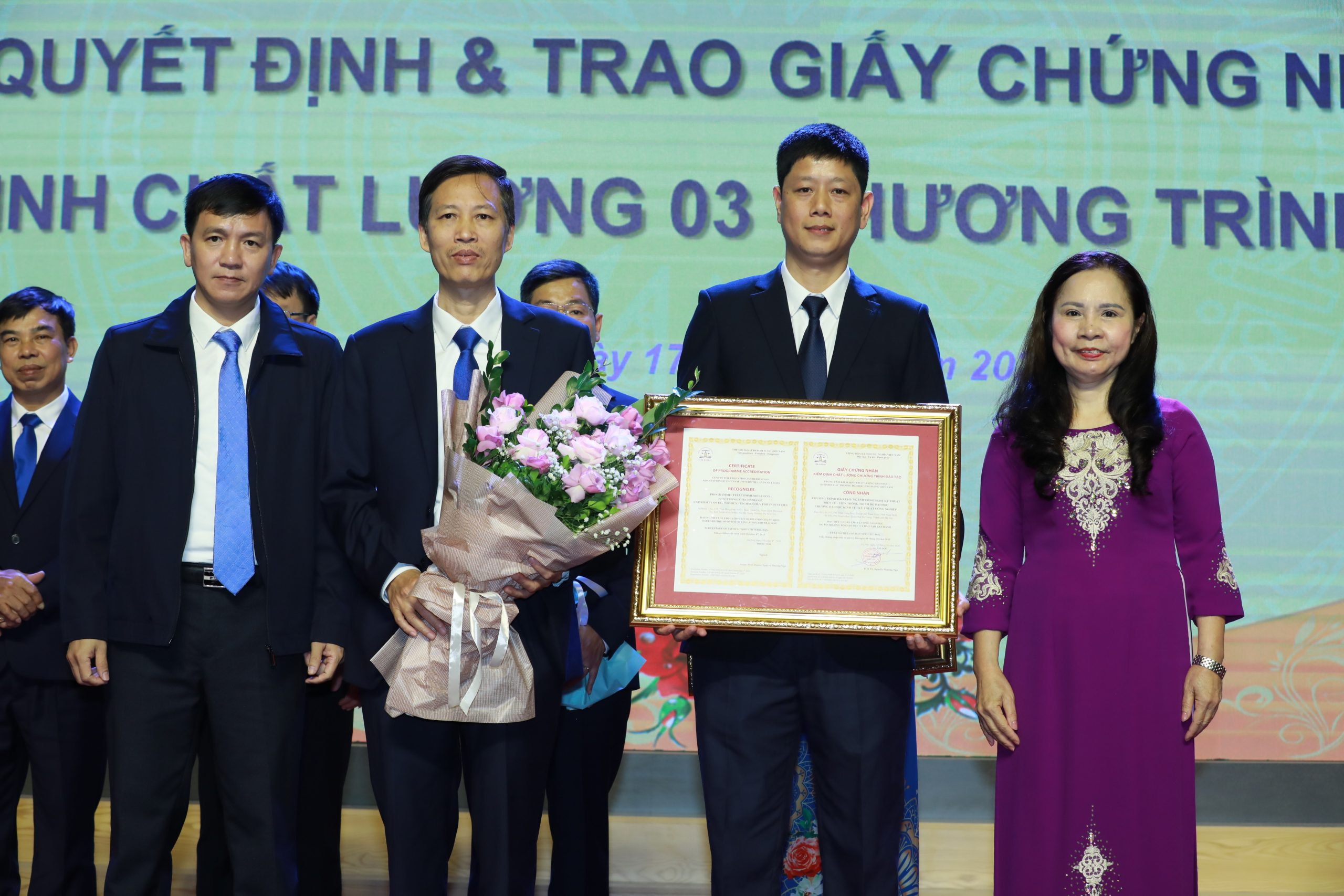 PGS.TS. Phạm Quốc Khánh – Phó Cục trưởng Cục Quản lý chất lượng – Bộ Giáo dục và Đào tạo và PGS.TS. Nguyễn Phương Nga, Giám đốc trung tâm kiểm định chất lượng giáo dục thuộc Hiệp hội các trường đại học, cao đẳng Việt Nam đã trao Giấy chứng nhận và tặng hoa chúc mừng Nhà trường.