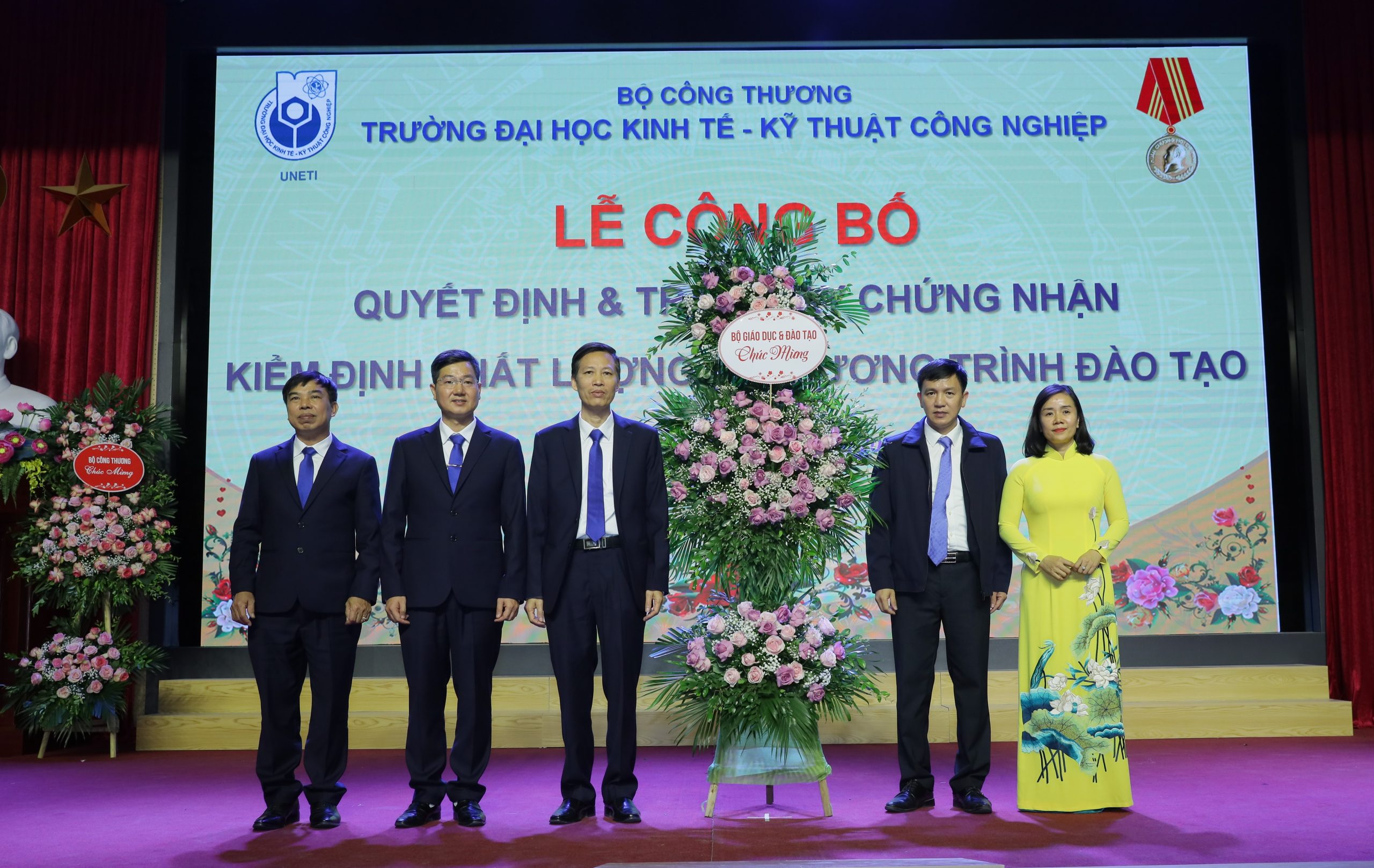 PGS.TS. Phạm Quốc Khánh – Phó Cục trưởng Cục Quản lý chất lượng – Bộ Giáo dục và Đào tạo và PGS.TS Nguyễn Phương Nga chụp ảnh lưu niệm với lãnh đạo Nhà trường và lãnh đạo 3 ngành đạt chuẩn kiểm định CLGD tại buổi lễ