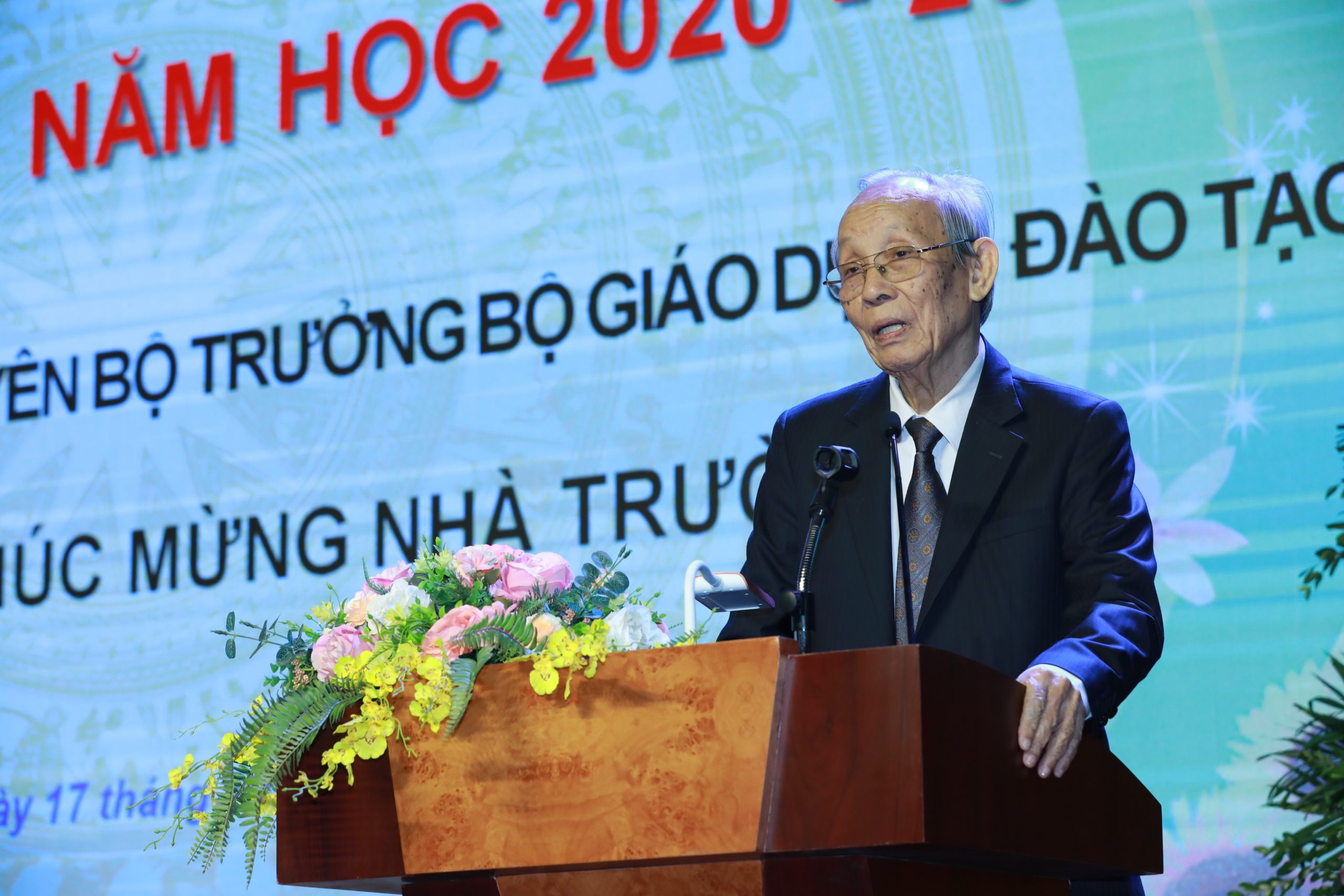GS.TS. Trần Hồng Quân – Nguyên Bộ Trưởng Bộ GD-ĐT, Chủ tịch Hiệp hội các trường Đại học, cao đẳng Việt Nam phát biểu và tặng hoa chúc mừng Nhà trường