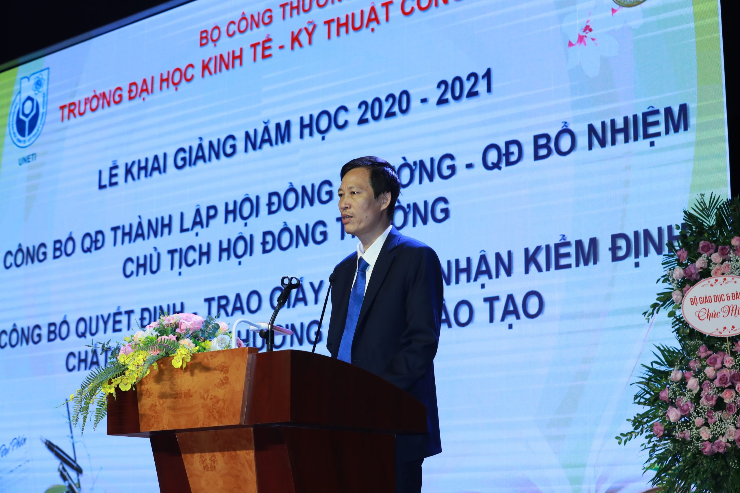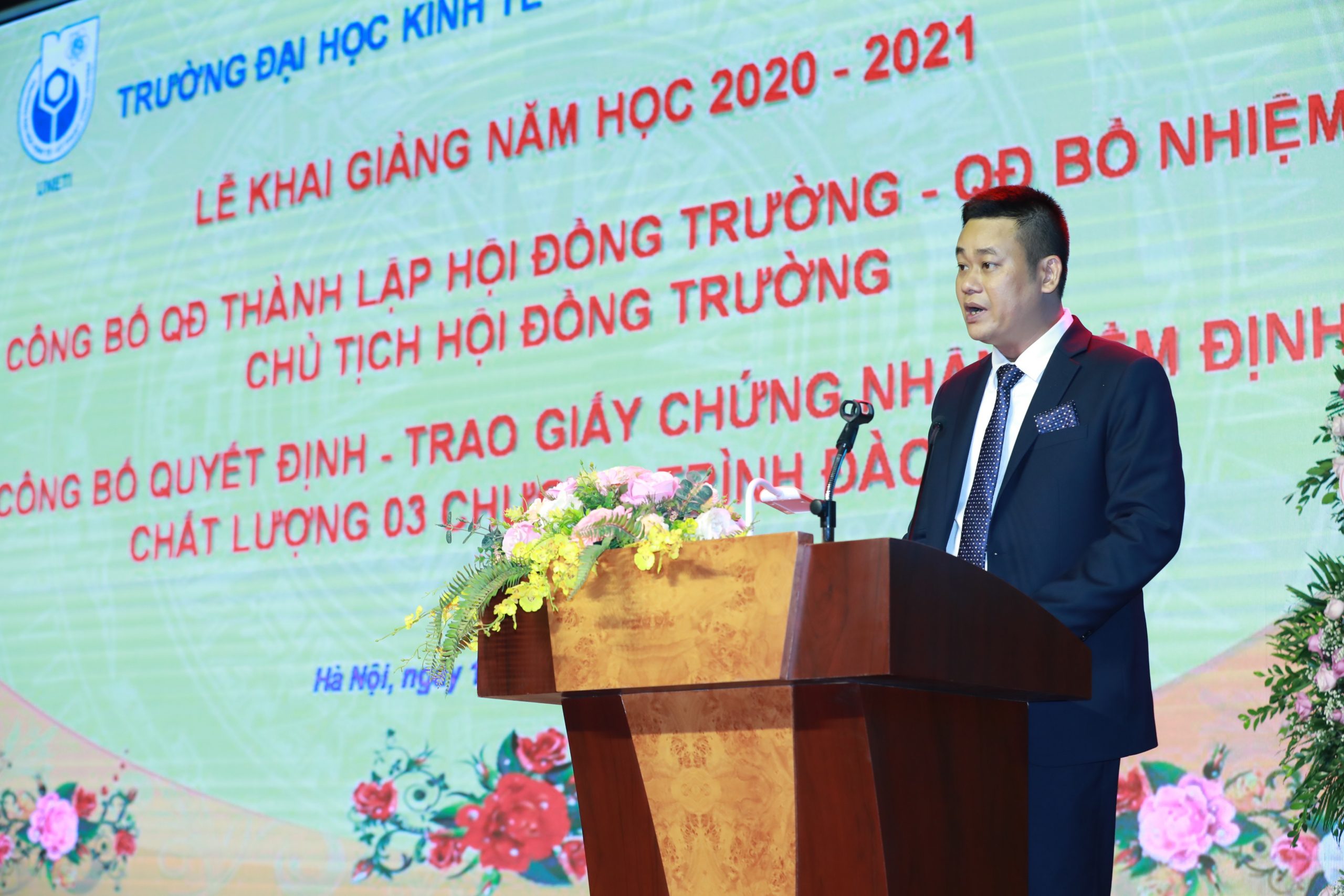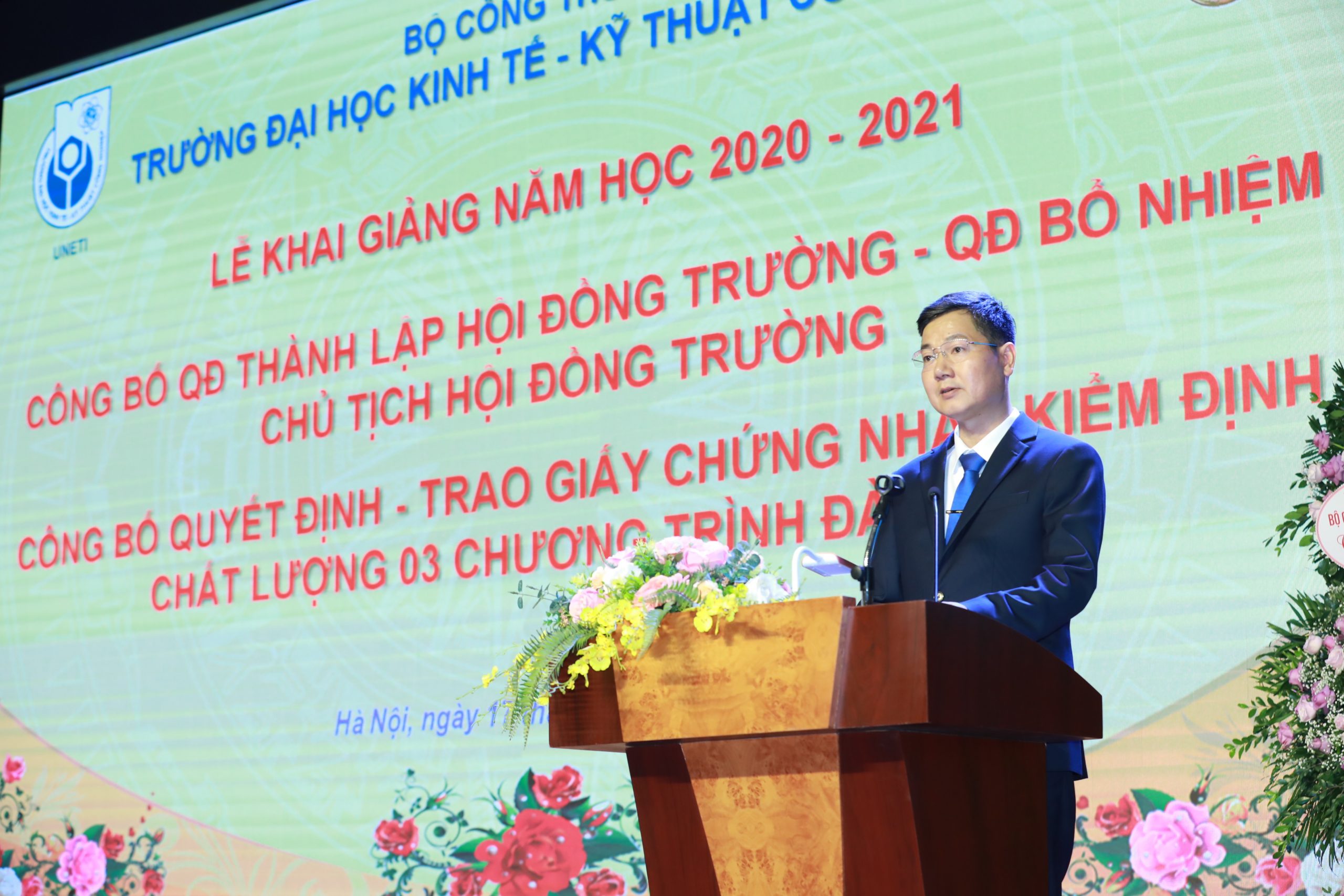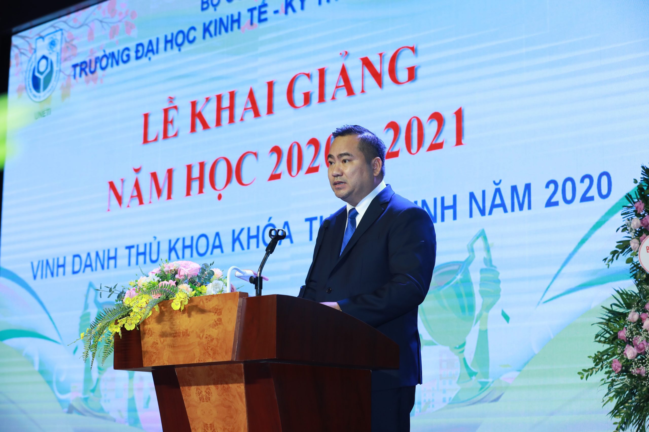 Trong bài diễn văn khai giảng năm học mới 2020 -2021, TS Trần Hoàng Long – Phó bí thư Đảng ủy, Hiệu trưởng Nhà trường nhiệt liệt chào mừng các vị đại biếu, các thầy cô giáo, cán bộ, công nhân viên và các em sinh viên tới dự Lễ khai giảng năm học mới 2020-2021; Công bố Quyết định thành lập Hội đồng trường – Quyết định bổ nhiệm Chủ tịch Hội đồng trường và Công bố Quyết định – Trao giấy chứng nhận kiểm định chất lượng 03 Chương trình đào tạo. Chúc mừng trên 5.000 tân sinh viên đại học niên khóa 2020-2024 đã vượt qua quá trình học tập THPT để chính thức trở tân sinh viên Uneti. “Năm học 2019-2020 đã đánh dấu sự cố gắng nỗ lực vượt bậc của tập thể sư phạm Nhà trường trong công cuộc thực hiện và hoàn thành mục tiêu kiểm định chất lượng đào tạo nhằm khẳng định vị thế, tạo tiền đề cho việc xây dựng văn hóa chất lượng trong Nhà trường. Trường ĐH Kinh tế – Kỹ thuật Công nghiệp đã thực hiện 3 đợt đánh giá ngoài, hoàn tất công tác khảo sát sơ bộ và khảo sát chính thức cho 9 Chương trình đào tạo/11 Chương trình đào tạo, cả 9 Chương trình đào tạo đã được đánh giá đạt tiêu chuẩn chất lượng giáo dục”. Thông qua nội dung phát biểu, Thầy Hiệu trưởng cám ơn sự quan tâm chỉ đạo của lãnh đạo các cấp, các cơ quan tổ chức, các doanh nghiệp, các cá nhân, đã luôn ủng hộ, đồng hành, đóng góp cho sự phát triển của Nhà trường. Đặc biệt là sự thống nhất, đoàn kết của tập thể lãnh đạo, các nhà giáo, cán bộ viên chức, học viên, sinh viên toàn trường trong năm học 2019-2020 đã nỗ lực không mệt mỏi, cống hiến tận tụy cho sự nghiệp giáo dục, chung tay họa một bức tranh đẹp về thành tựu của Nhà trường. Với chủ điểm của năm học 2020-2021 là “Đổi mới hệ thống quản trị, xây dựng môi trường văn hóa thân thiện, hướng tới người học” Trường Đại học Kinh tế – Kỹ thuật Công nghiệp kiên định mục tiêu đẩy mạnh hoạt động kiểm định và đánh giá chất lượng dạy và học; thu hút sinh viên bằng chất lượng đào tạo, môi trường làm việc và học tập năng động, nghiêm túc. Tập thể lãnh đạo Nhà trường cùng toàn thể cán bộ, giảng viên và sinh viên hoàn toàn tin tưởng, với truyền thống đoàn kết, nhất định sẽ biến những khó khăn thành động lực cho phát triển, chuyển hóa những thách thức thành cơ hội để đi lên, đẩy mạnh quá trình đổi mới, luôn kiên định giữ vững và nâng cao chất lượng tiếp tục khẳng định vị thế là trường đại học hàng đầu của Bộ Công Thương và phấn đấu phát triển hơn nữa đối với cả nước và trong khu vực, xứng đáng với kỳ vọng của các thế hệ cán bộ, sinh viên, sự tin tưởng của các cấp lãnh đạo Đảng, Nhà nước và của toàn xã hội.