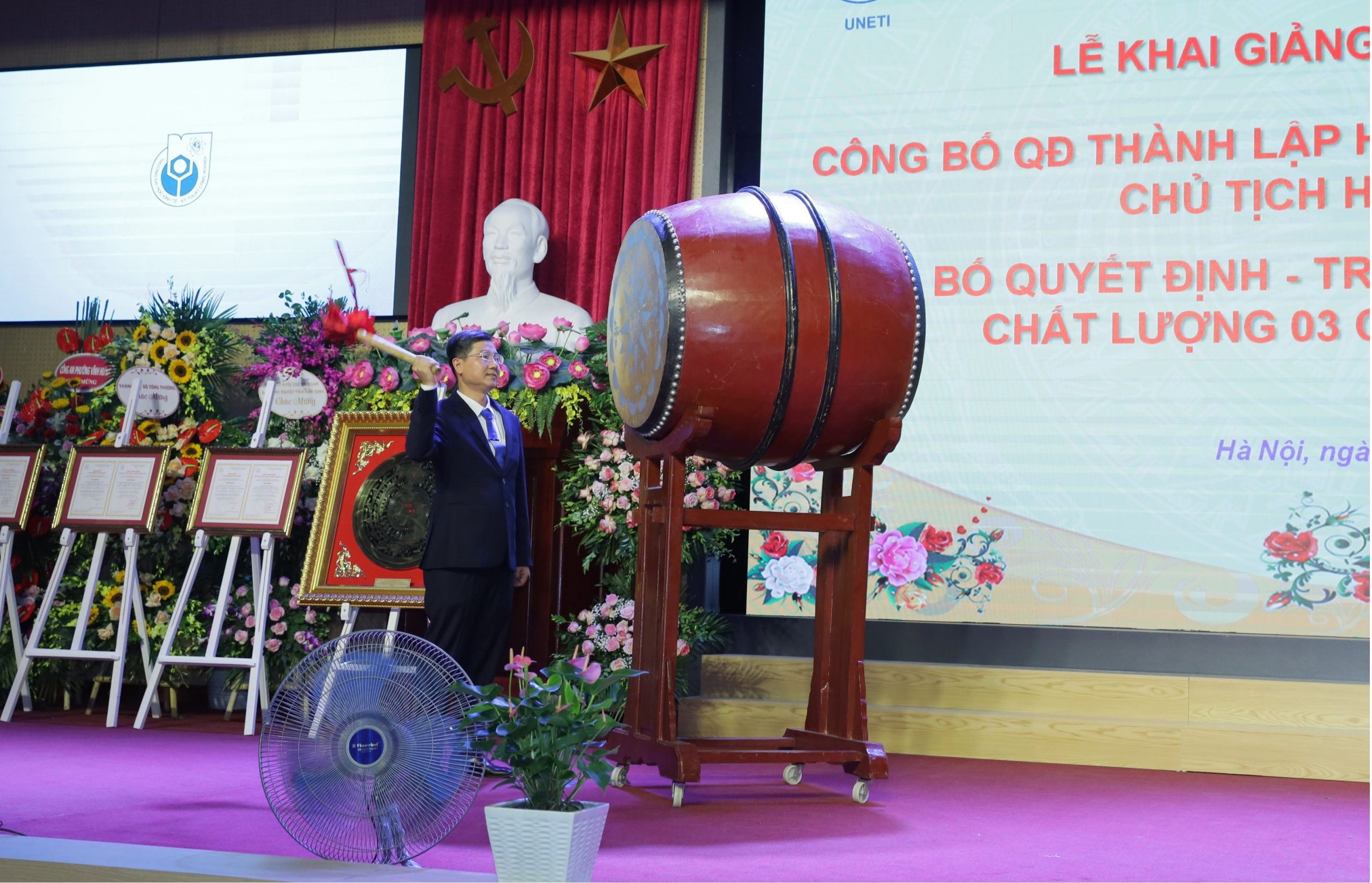 Sau diễn văn khai mạc, TS Trần Hoàng Long – Phó bí thư Đảng ủy, Hiệu trưởng Nhà trường đã đánh trống khai giảng năm học mới 2020-2021.
