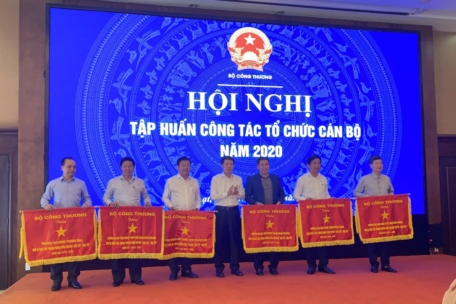 Ông Lý Quốc Hùng – Vụ trưởng Vụ Tổ chức Cán bộ trao Cờ danh hiệu Đơn vị xuất sắc trong phong trào thi đua “Dạy tốt – Học tốt” năm học 2019-2020 cho các cơ sở giáo dục.