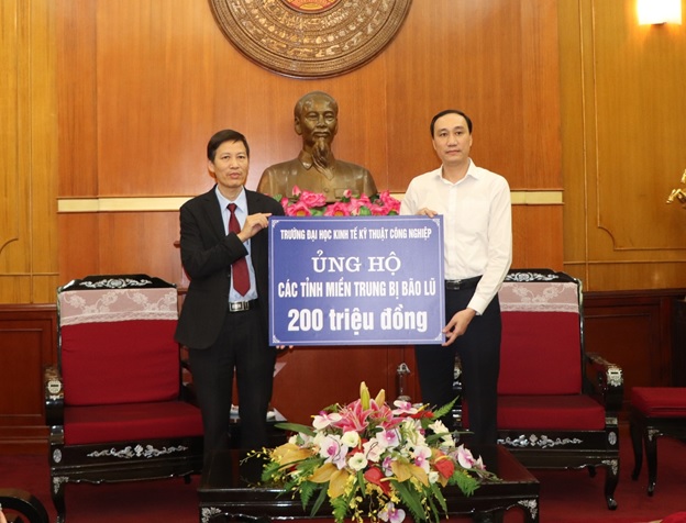 Phát biểu tại buổi gặp, NGƯT.TS Trần Đức Cân – Bí thư Đảng ủy, Phó Hiệu trưởng Nhà trường hy vọng với số tiền ủng hộ và những tình cảm của tập thể cán bộ, giảng viên và công nhân viên Trường Đại học Kinh tế – Kỹ thuật Công nghiệp sẽ giúp bà con vùng lũ có thêm nguồn lực vượt qua khó khăn, sớm khôi phục ổn định lại cuộc sống.